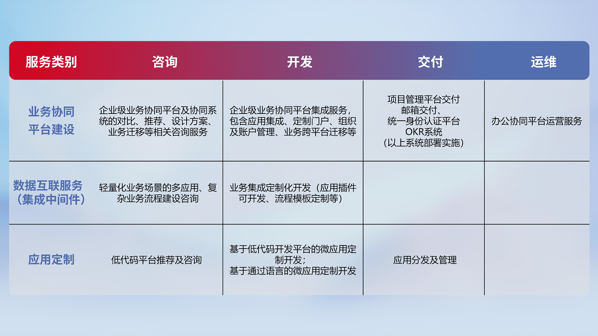 针对钉钉、、、、企微、、、IDaas等平台级产品提供产品的规划、、、、方案、、、、交付、、定制化开发等服务,,实现如统一协同办公、、智能客户服务、、混合会议管理、、、智能数据查询、、、、等业务场景,,,实现数字化转型。。。
