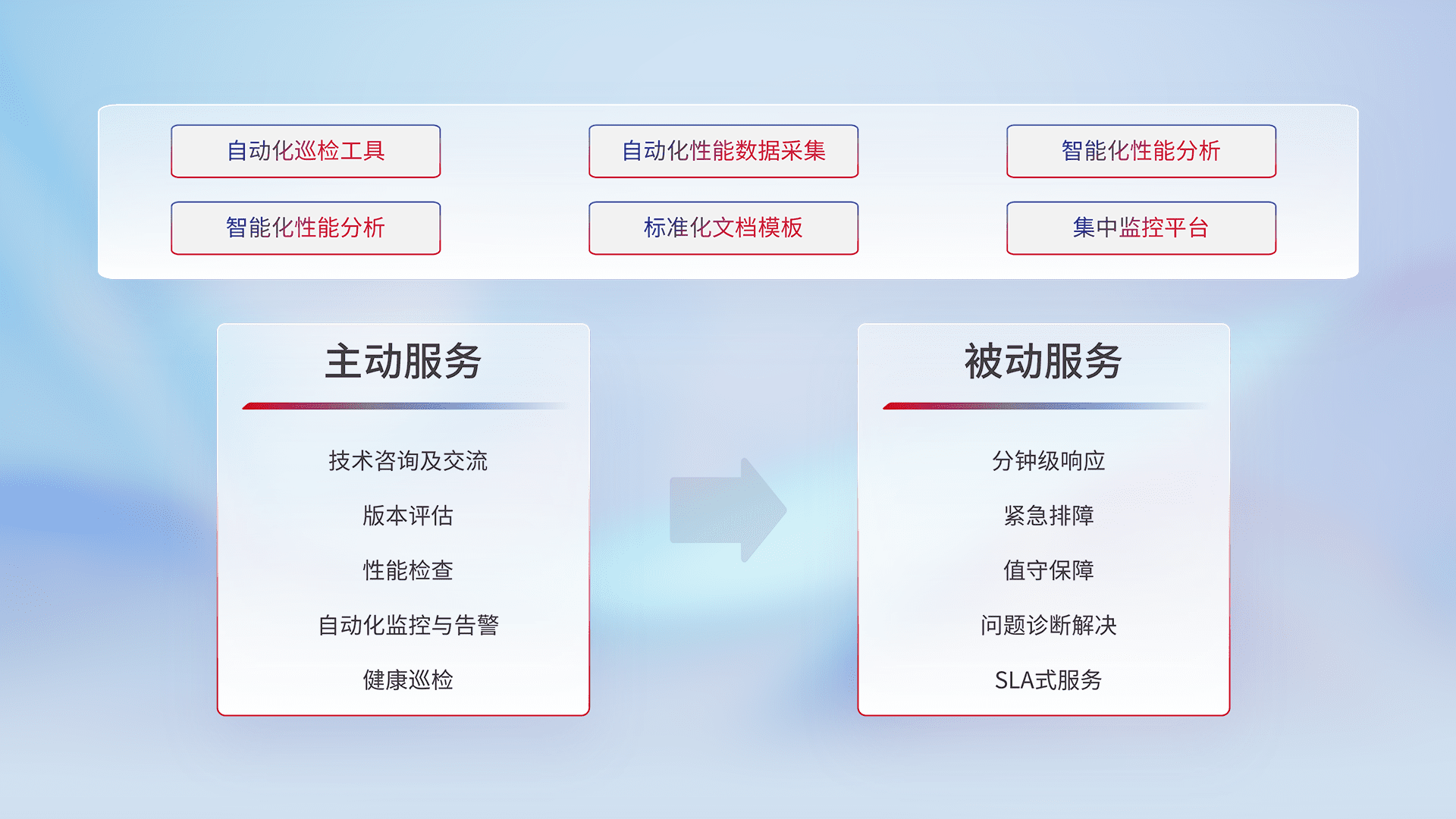 智能化工具和标准化文档,,,保障服务质量,,,,提供主动服务(包含技术咨询、、、、版本评估、、、性能检查、、、、自动化监控与告警、、、健康巡检)和被动服务包含(分钟级响应、、、、紧急排障、、值守保障、、、问题诊断解决、、、、SLA服务)。。
